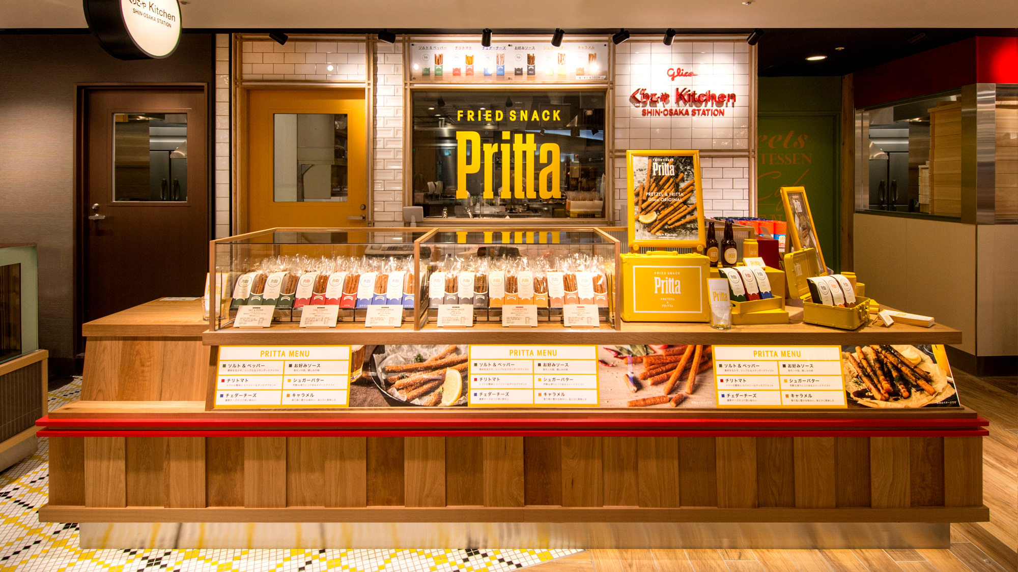 駅構内のスーベニヤショップという特性から、カウンターとその背面の壁という最小限の空間のなかで、プレッツェルをイ...メージさせる木の線材をデザインテイストとしてリズミカルに用いると共に、グリコのコーポレートカラーの赤色とPrittaの商品カラーである黄色を合わせた楽しさのあるデザインでグリコの世界観をつくりだした。