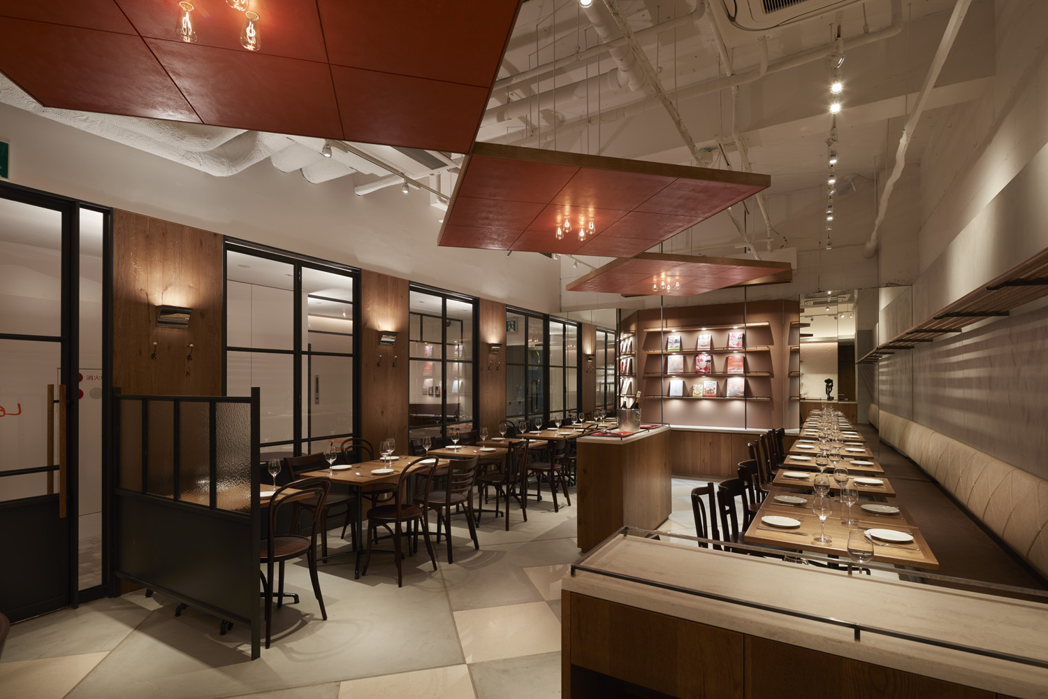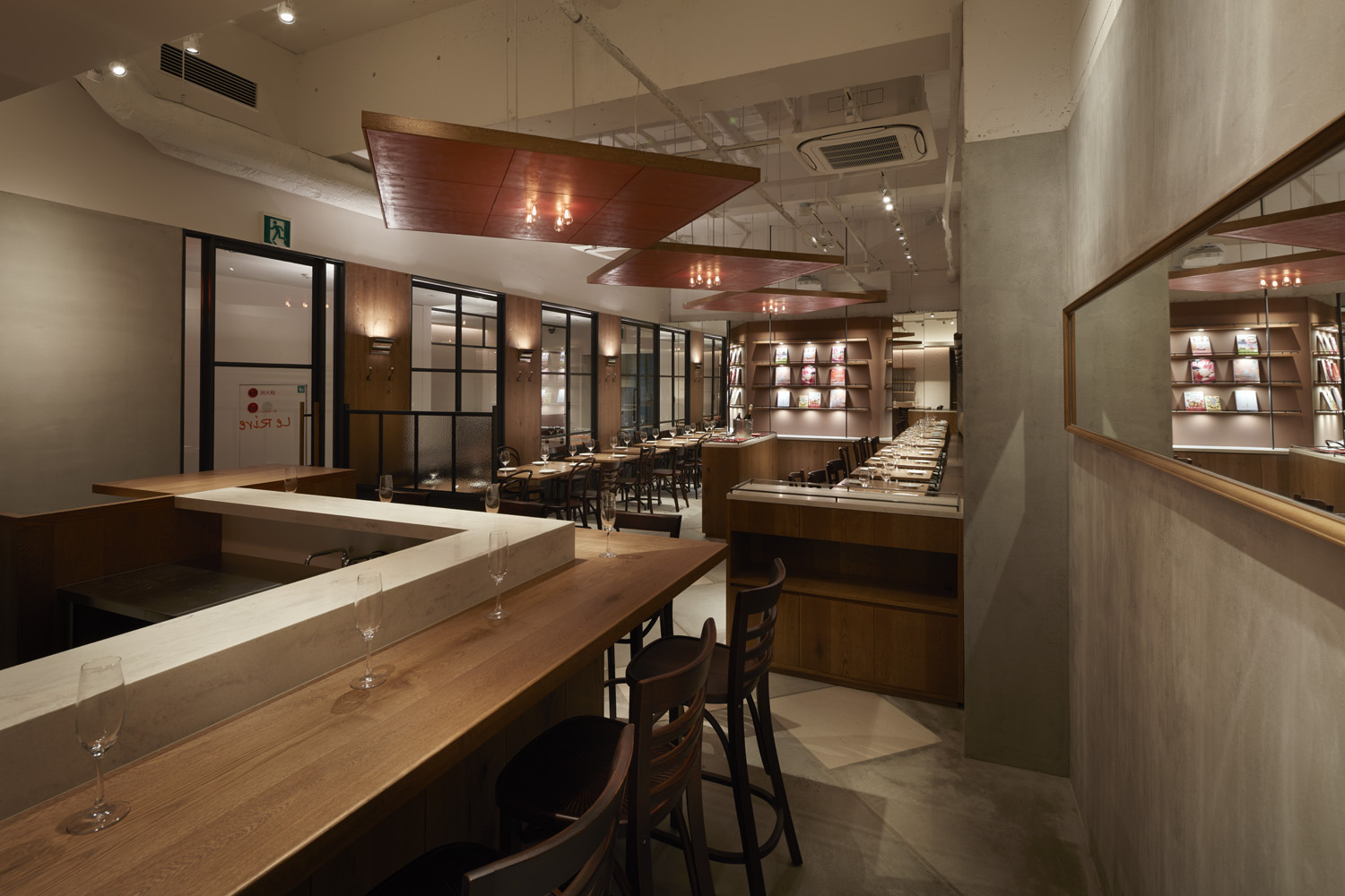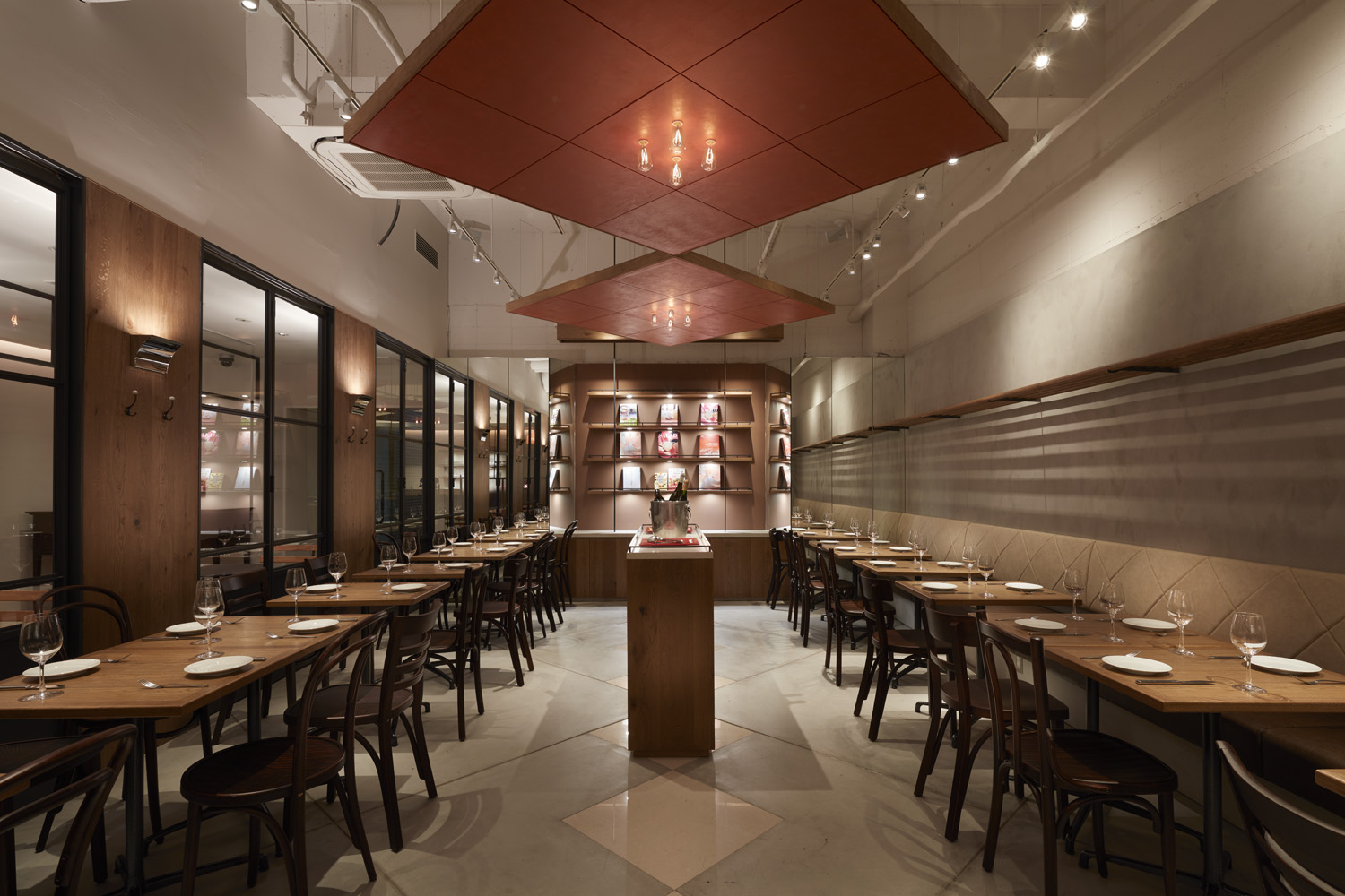 そこで、ブラッスリー本来の意味でもあるビアホールを表現し、一つの大きな空間としている。