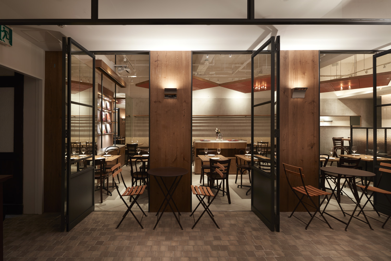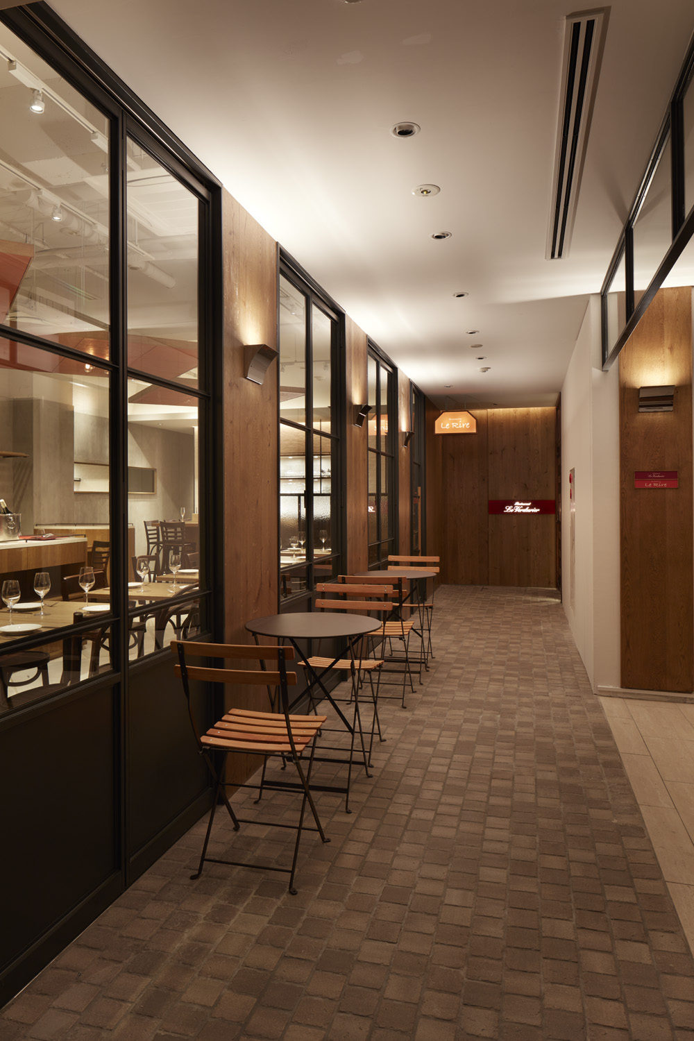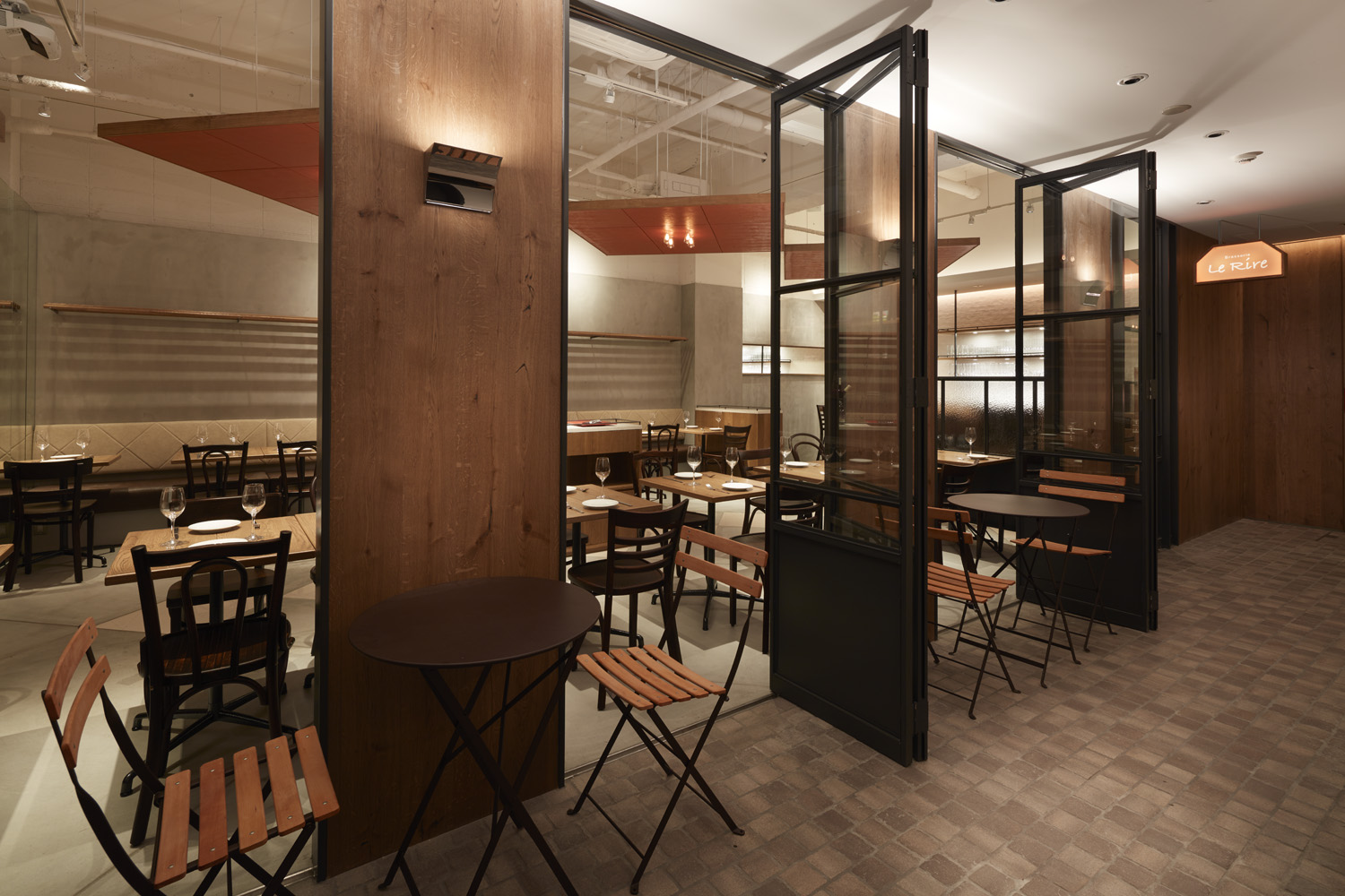 本プロジェクトのブラッスリー、ル リールをパッサージュの中心に配置し、開...放感のあるファサードとする事で、手前のビストロ、奥のレストランをつなぐ役割を果たすようにしている。