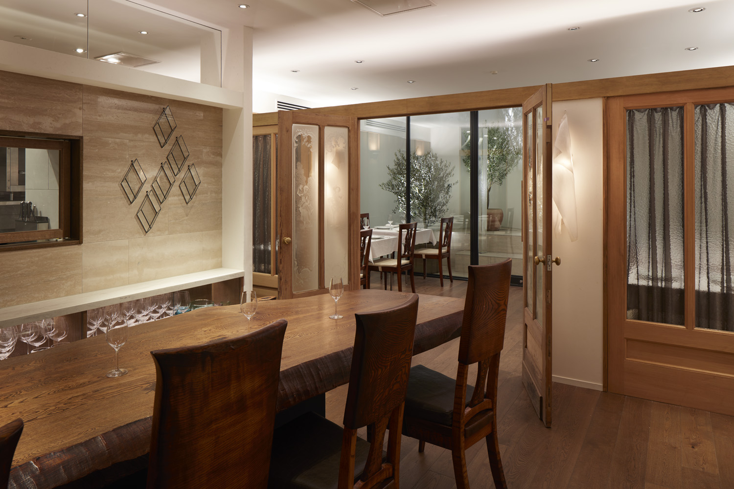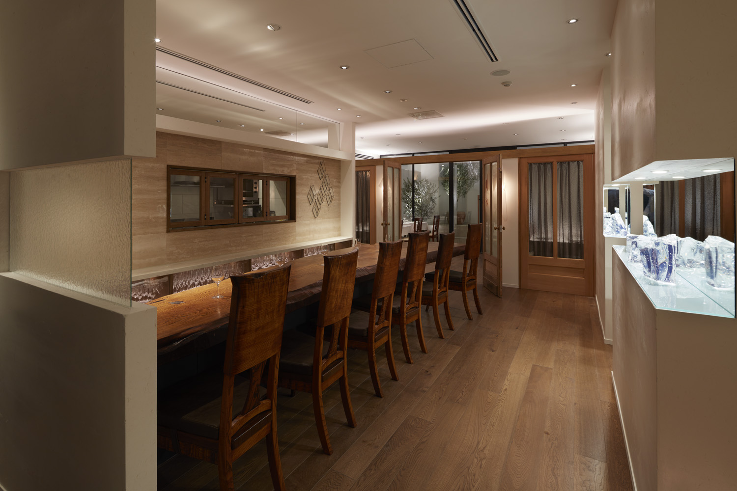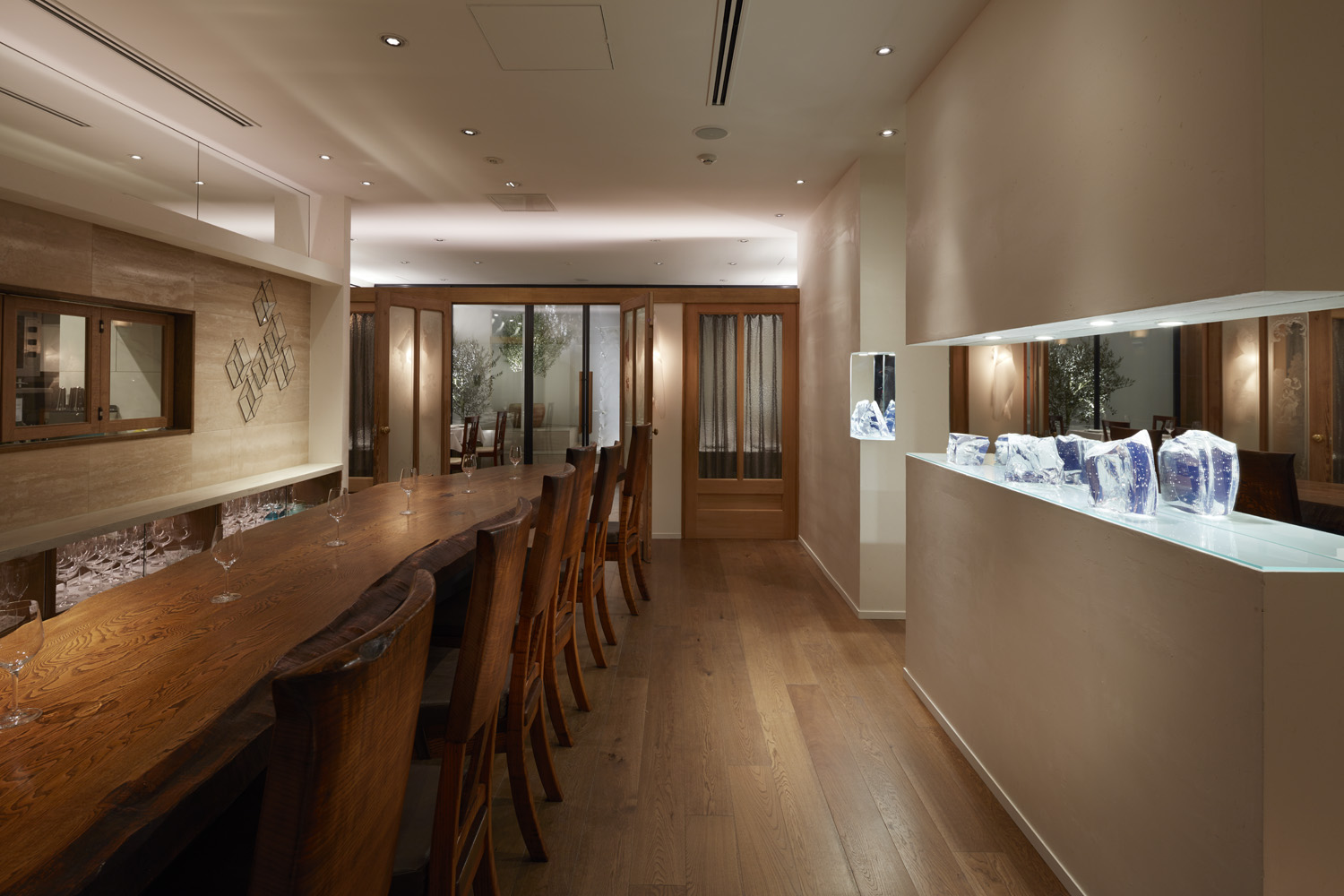 入り口には古城で使用されていた重厚な扉でお迎えし、バースペースでは立派なカウンターでウェルカムドリンクを楽しみ、エッチングガラスの扉を開けるとレストランスペースへというストーリーを描き、2つの部屋でそれぞれ違う世界観を楽しんでいただけるよう心がけた。
