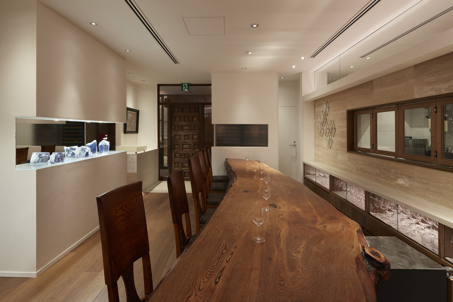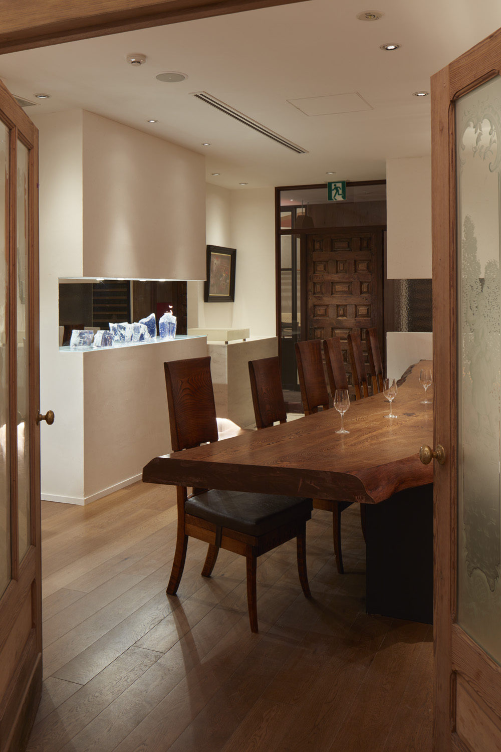 営業されていた以前の店舗へ伺ったところ、17世紀のフランスの古城で使用されていた扉、立派な無垢材のカウンター、アン...ティークのエッチングガラス扉、作家に依頼したオーダーチェア、光学ガラスのディスプレイなど、立派な素材が使用されていたことから、移転ではなく移築とコンセプトに掲げ、使用する素材を丁寧に解体、採寸を行い構成していった。